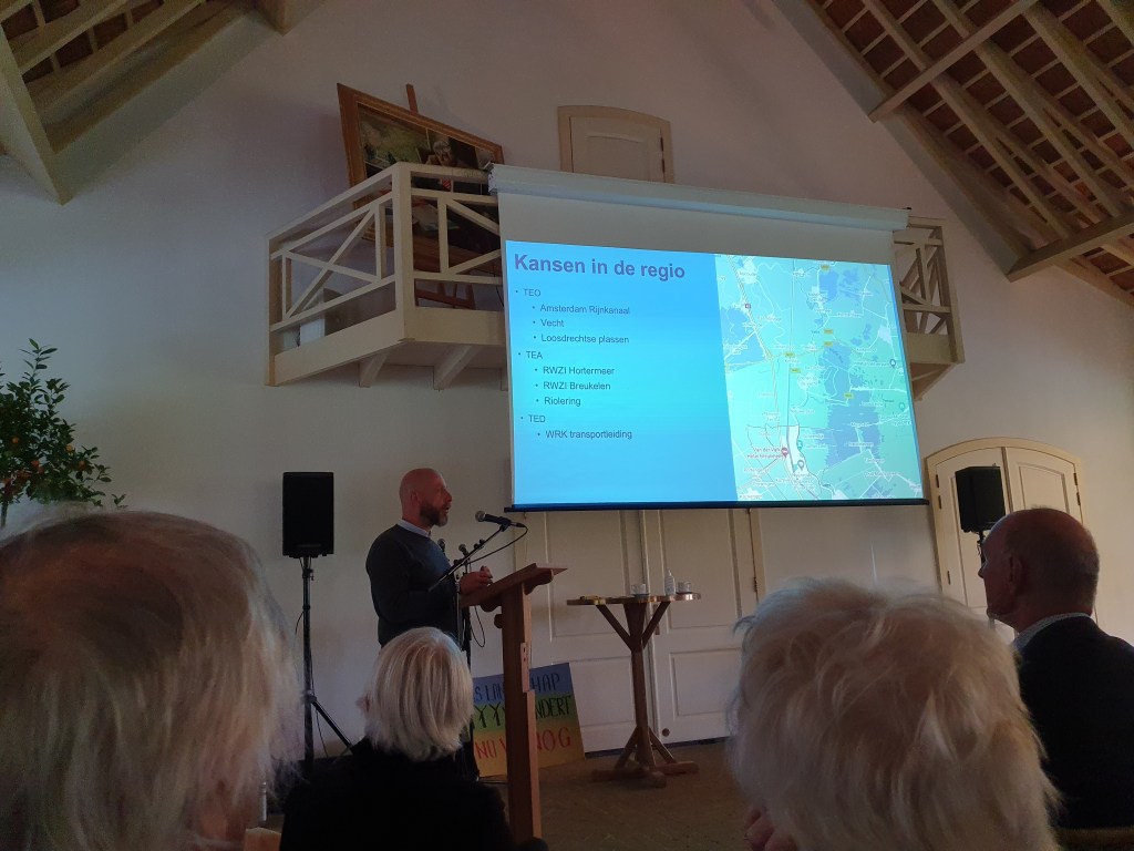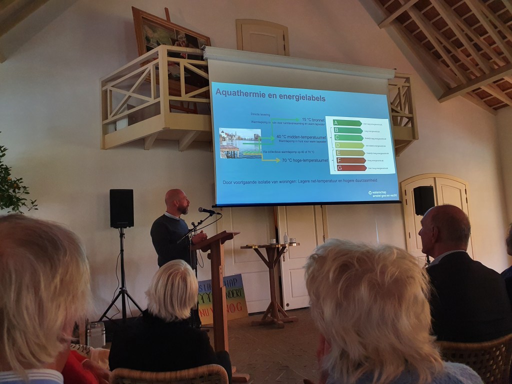 Ben de Ru van Waternet stond uitgebreid stil met deze relatief nog onbekende energiebronnen. Afval- en drinkwater, maar ook rioolwater kunnen in combinatie met elektriciteit veel warmte afgeven. Die energiebron is voor kleinschalig gebruik al profijtelijk. Binnenkort start daarmee een proef rondom de rioolzuivering in Ankeveen. Waternet wil daarnaast meer proeven doen in onze regio.