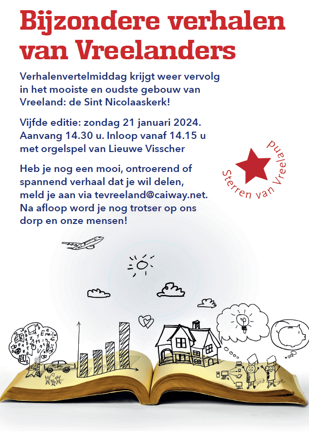 En mocht je zelf ook verhaal van maximaal vijf minuten kunnen en willen vertellen, meld je dan aan via tevreeland@caiway.net. En kijk voor de zekerheid nog even naar onze poster voor de juiste tijden!
